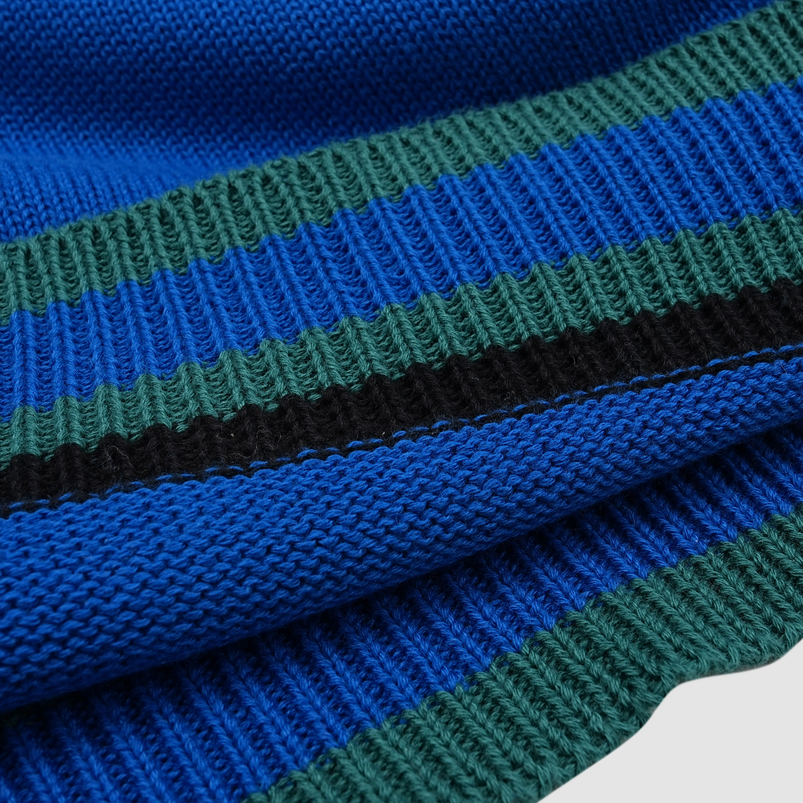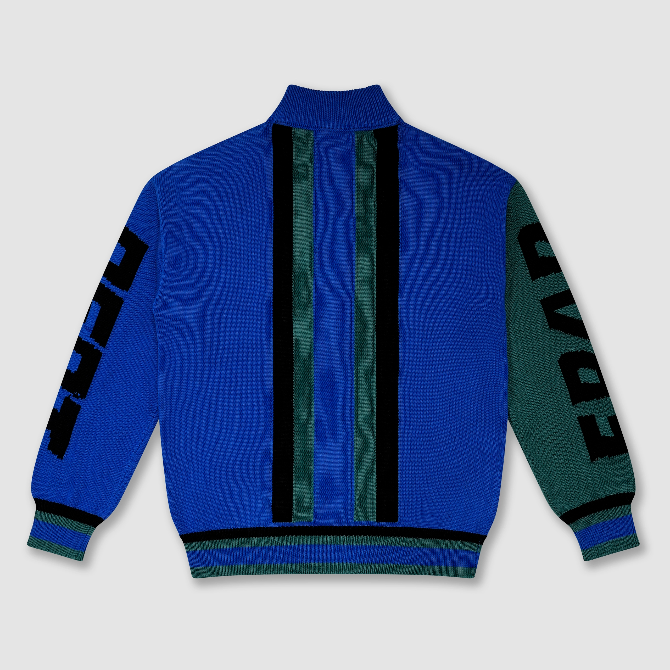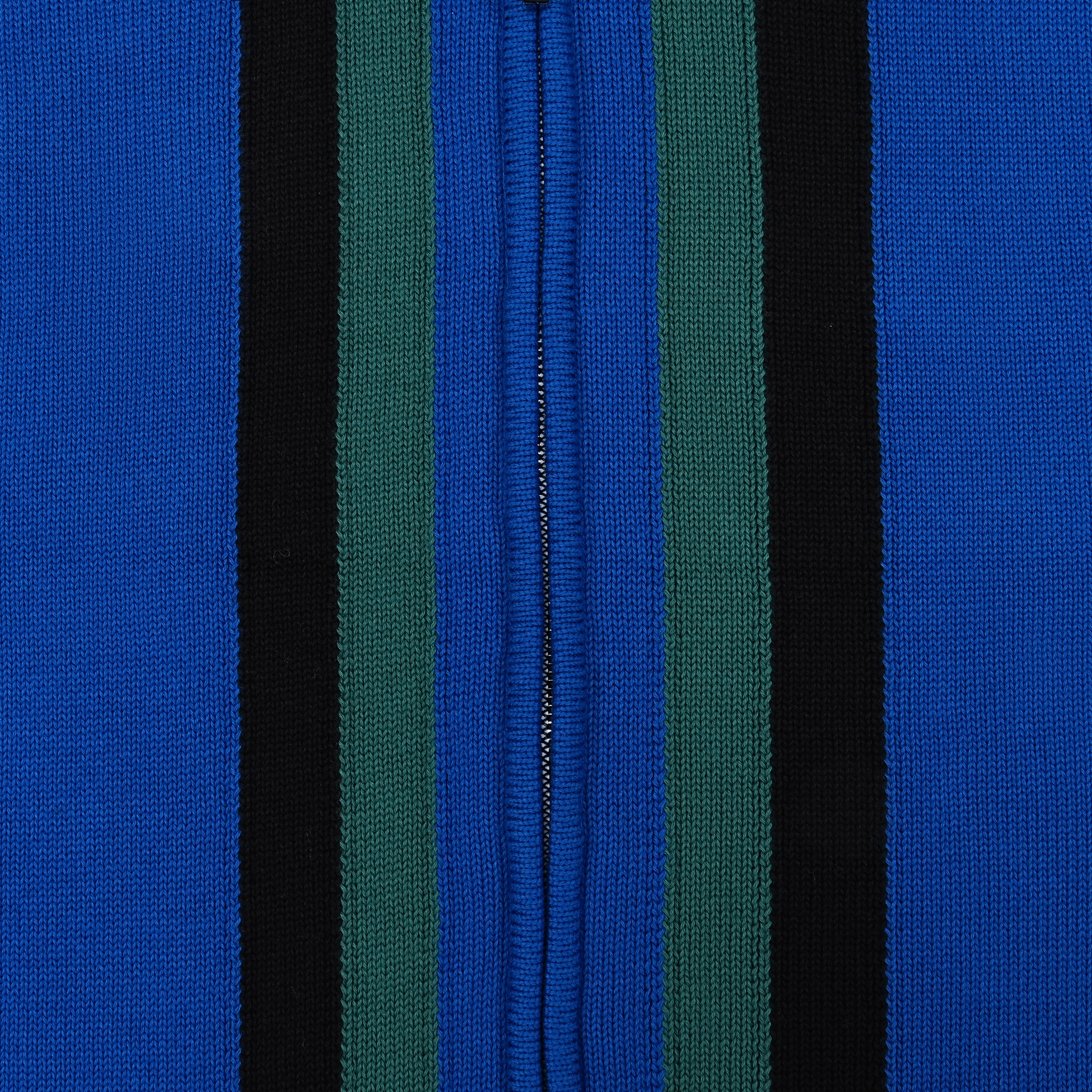 Bright blue body with green and black vertical stripes